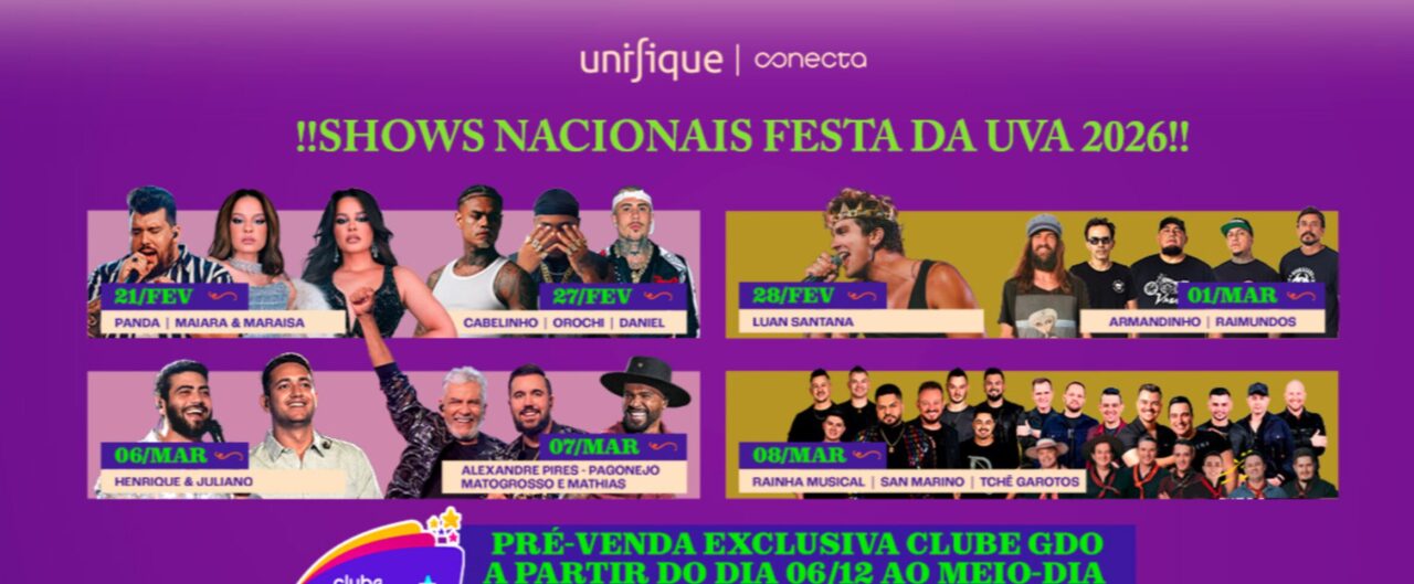 A venda de ingressos será feita em duas etapas: a pré-venda exclusiva para associados do Clube GDO ocorre de 6 a 9 de dezembro, com benefícios como parcelamento em até três vezes e isenção de taxa de serviço nas compras presenciais. A comercialização geral inicia ao meio-dia do dia 9. Os valores variam conforme o setor escolhido, com entradas a partir de R$ 50 (meia-entrada) até camarotes de R$ 3 mil, sendo que todos os ingressos garantem acesso ao Parque da Festa da Uva. Aos domingos, haverá shows na Arena Multicultural com preços populares a partir de R$ 20.