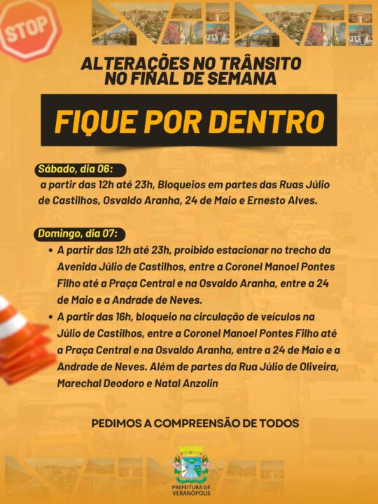 A Administração Municipal solicita a compreensão de todos e orienta que os motoristas redobrem a atenção e planejem seus deslocamentos com antecedência, a fim de evitar transtornos durante os eventos.