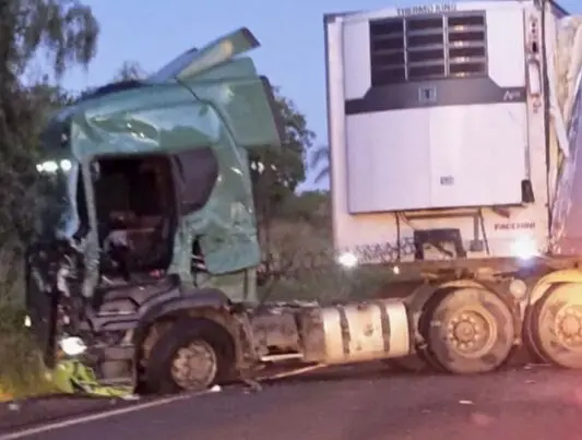 A colisão frontal seguida de abalroamento fez com que uma das carretas bloqueasse parcialmente a rodovia, enquanto o veículo de menor porte saiu da pista e parou na vegetação ao lado da via.