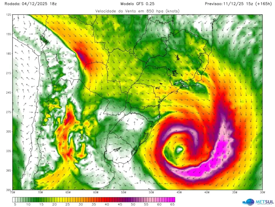 A MetSul Meteorologia alerta para a alta possibilidade de um intenso ciclone extratropical se formar entre o Rio Grande do Sul e o Uruguai, com previsão de atuação entre a terça-feira, 9 de dezembro, e a quarta-feira, 10 de dezembro, da próxima semana. A formação, conhecida como ciclogênese, será impulsionada pela interação de uma baixa pressão em altitude vinda do Pacífico com uma baixa pressão em superfície vinda do Paraguai. O cenário é de grande perigo, com potencial para tempestades severas, vento intenso e volumes de chuva significativos.