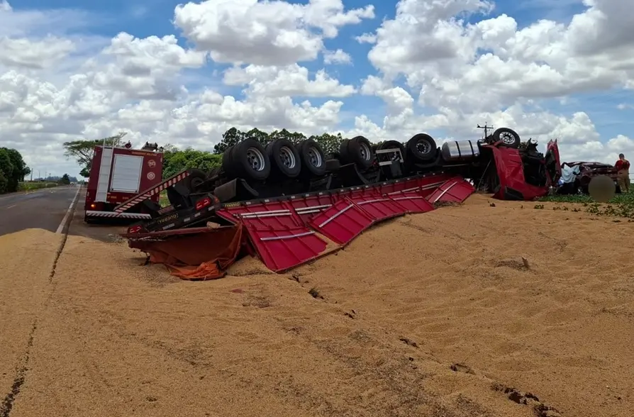 Colisão frontal entre carreta carregada de grãos e carro de passeio deixou duas vítimas fatais na manhã desta terça-feira