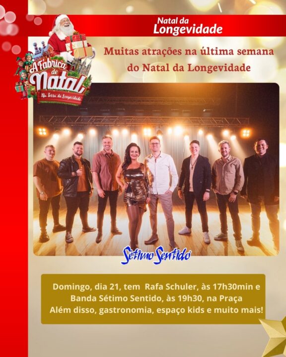 No sábado, 20 de dezembro, a programação começa cedo, das 9h15 às 11h15, com o tradicional Café com o Noel, no Hotel Princesa dos Vales (reservas pelo telefone (54) 99951-2003). Às 10h30, na Praça Central, acontece o Sorteio da Campanha de Natal ACIV 2025. Durante a tarde e noite, a Vila do Papai Noel reabre às 16h, seguida do espetáculo “Um Sonho de Natal”, com a Caravana da Ilusão Cia. Teatral, às 19h30, e da Caravana do Papai Noel da Alumiconte, às 20h30.