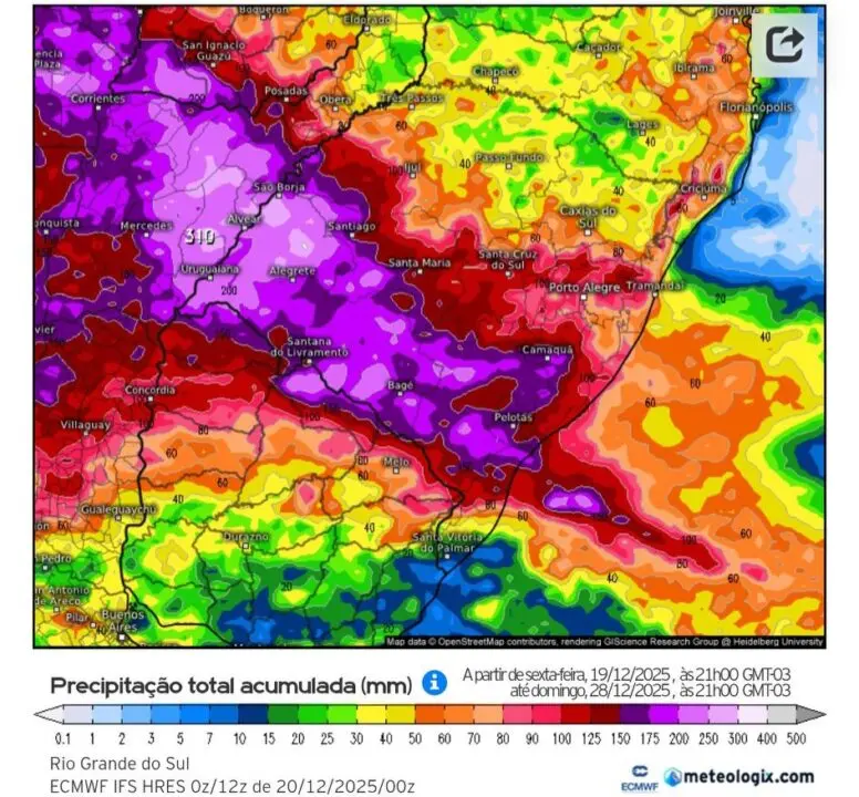 Os volumes de precipitação projetados são alarmantes, com diversos pontos do território gaúcho podendo registrar acumulados entre 150 mm e 200 mm. Em áreas isoladas, os totais podem atingir a marca de 300 mm até o próximo domingo, 28 de dezembro. Durante este intervalo, a chuva será intercalada apenas por curtos períodos de sol e calor intenso, mantendo a atmosfera carregada e propensa a eventos climáticos extremos em diversas regiões.