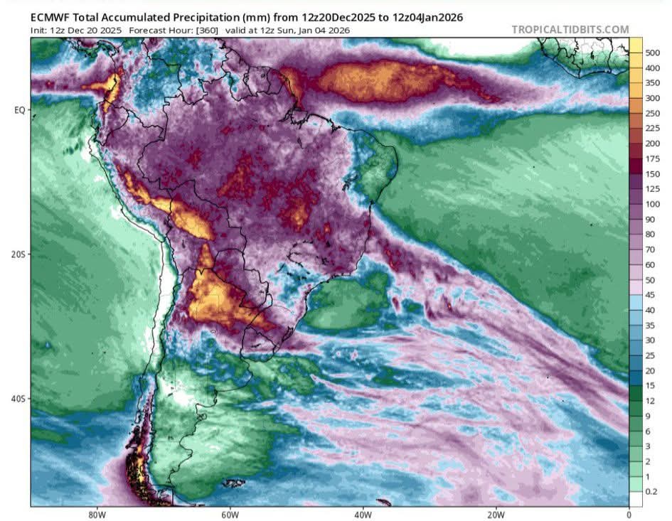 O mapa de precipitação acumulada do modelo europeu ECMWF evidencia claramente esse cenário, destacando as áreas com maiores volumes de chuva previstos.