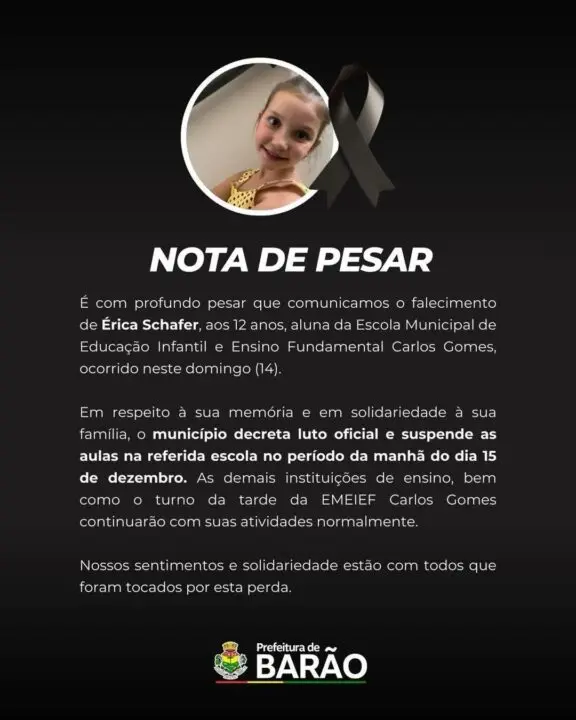 Em respeito à perda e à dor enfrentada pela comunidade escolar, a Prefeitura de Barão decretou luto oficial por dois dias. Como forma de homenagem à memória da estudante, as aulas da Escola Municipal Carlos Gomes, onde Érica cursava o 6º ano, foram suspensas no turno da manhã desta segunda-feira, 15 de dezembro. As demais instituições de ensino da cidade continuam funcionando normalmente.