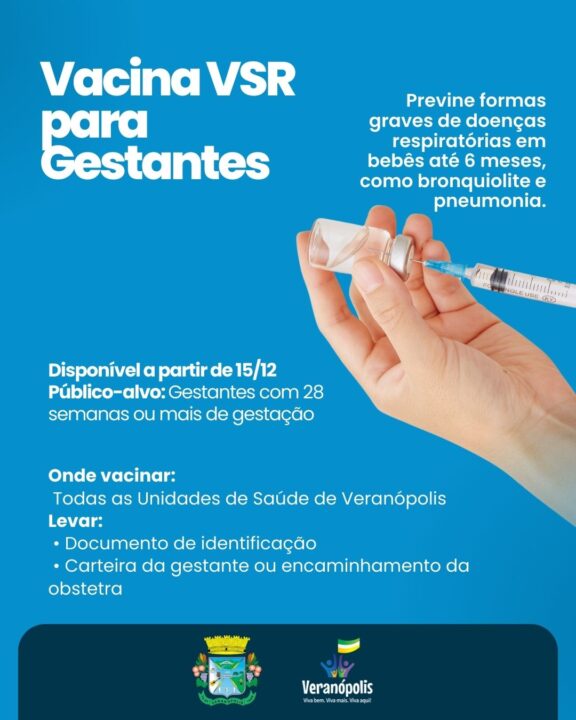 A Secretaria Municipal da Saúde de Veranópolis, por meio da Coordenação de Imunizações, informa que, a partir de segunda-feira, 15 de dezembro, está disponível no município a vacina contra o vírus sincicial respiratório (VSR – tipos A e B) para todas as gestantes com 28 semanas ou mais de gestação.