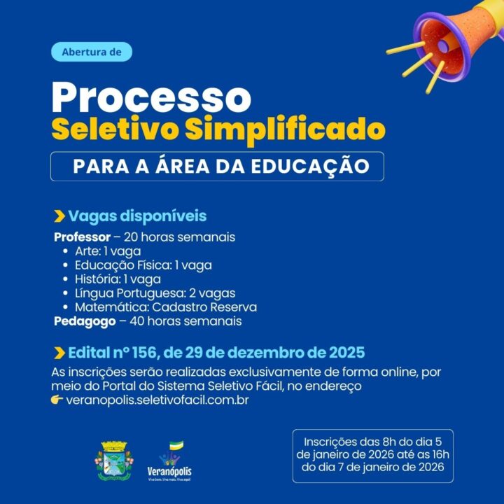A Prefeitura de Veranópolis anunciou a abertura de processo seletivo simplificado para contratação de profissionais da área da Educação, conforme o Edital nº 156, de segunda-feira, 29 de dezembro de 2025.