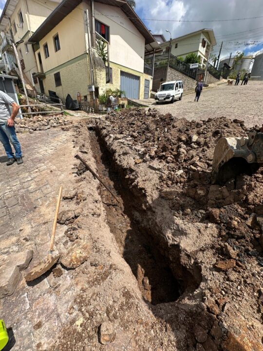 A Secretaria de Infraestrutura Urbana de Veranópolis está executando serviços de conserto de tubulação e correção de desníveis na Rua José Veríssimo de Oliveira, no bairro Valverde.