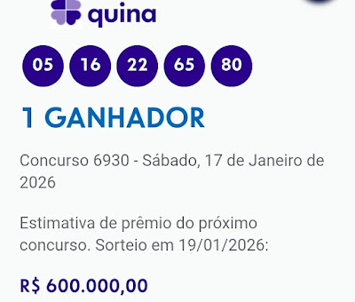 Após a entrega do prêmio milionário, a estimativa para o próximo concurso da Quina é de R$ 600 mil. O sorteio será realizado na segunda-feira, 19 de janeiro, e os interessados podem registrar suas apostas até as 19h do dia do certame em casas lotéricas credenciadas ou pelos canais eletrônicos oficiais.