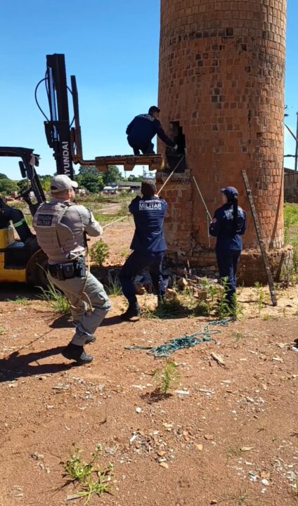 A equipe policial foi acionada pelo COPOM após informações de que um homem estaria preso no interior de uma chaminé. No local, o responsável pela propriedade relatou ter ouvido gritos de socorro, o que motivou o chamado às autoridades.