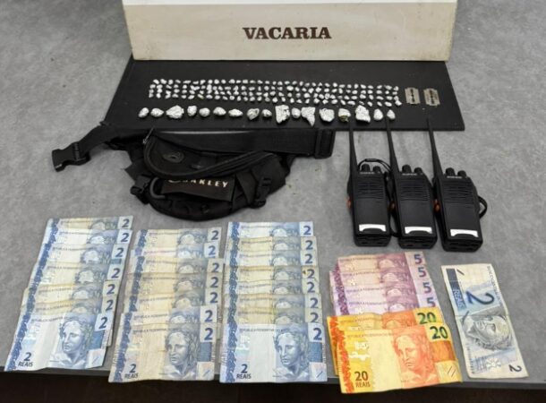 Na revista pessoal, os policiais encontraram com um dos suspeitos uma pochete contendo porções de crack e maconha, além de um rádio comunicador e dinheiro em espécie. Com o outro, foi apreendida uma porção de maconha, que ele teria acabado de comprar no local.