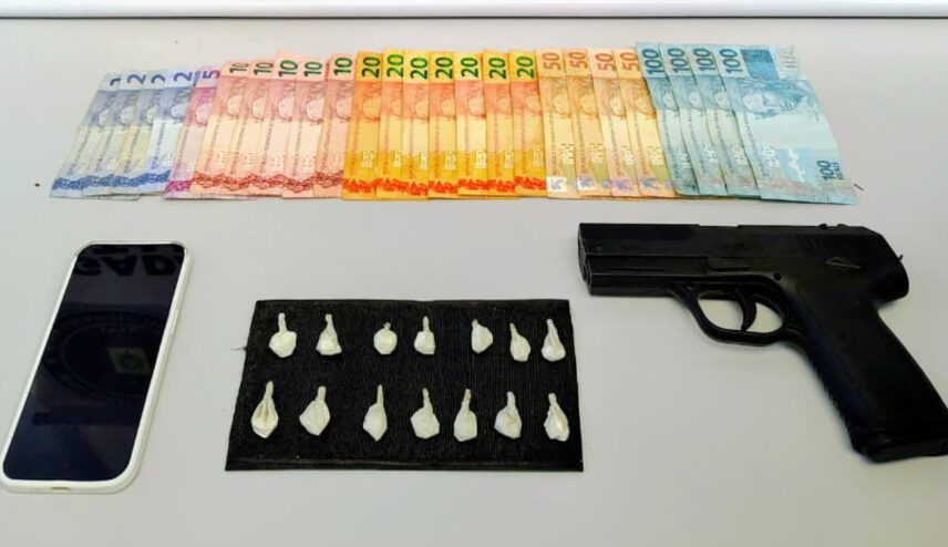 Durante a ação, os policiais abordaram um homem de 23 anos e encontraram com ele 14 porções de cocaína, já fracionadas e prontas para a venda, além de um simulacro de arma de fogo, R$ 803,00 em espécie e um aparelho celular.