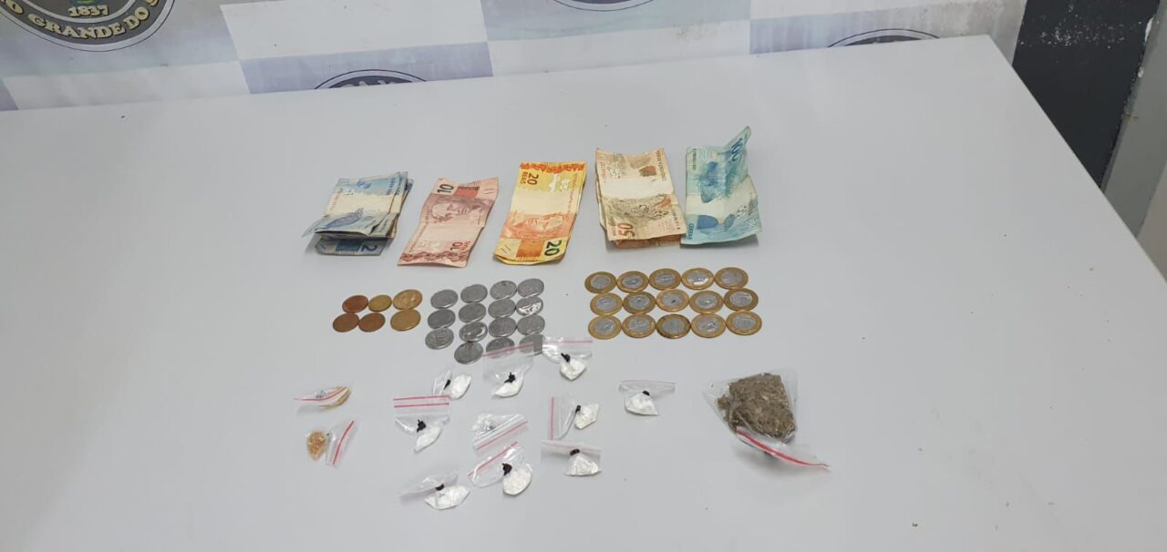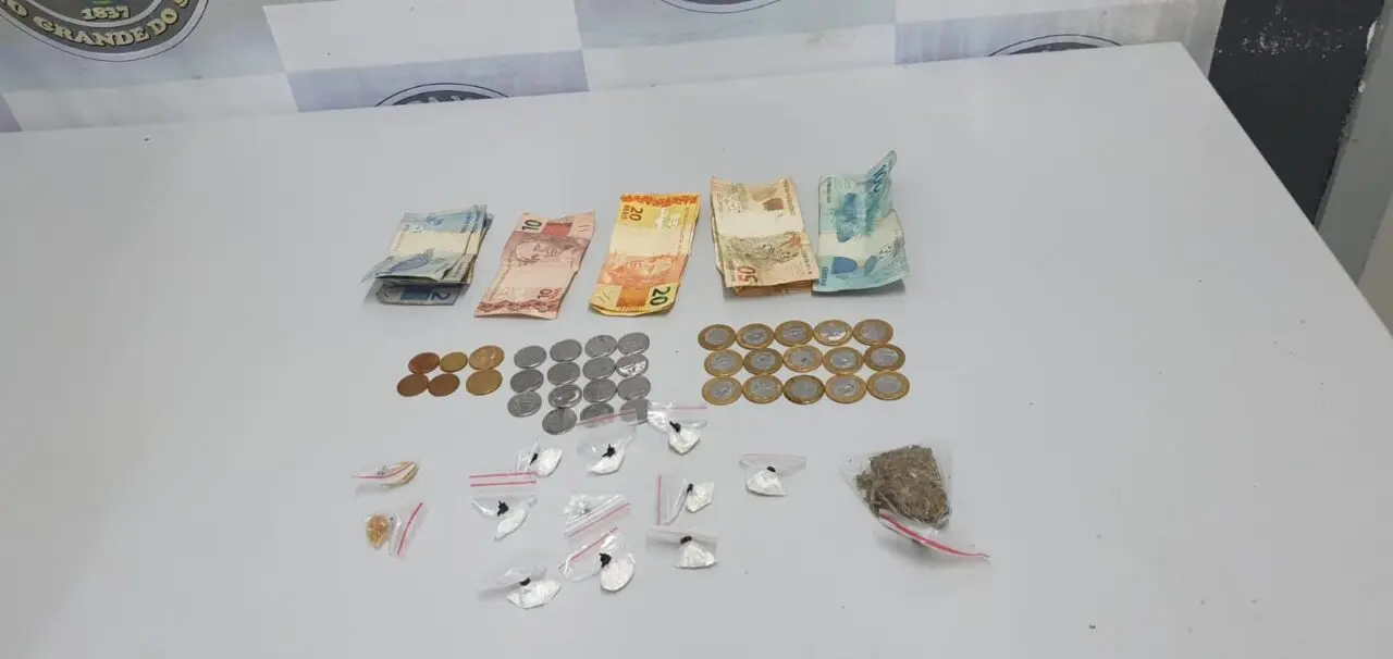 Durante patrulhamento ostensivo, a equipe abordou um veículo GM Onix de cor prata. No banco do carona, os policiais localizaram uma sacola plástica contendo 10 porções de substância branca análoga à cocaína, duas porções de substância amarela análoga ao crack e uma porção de substância de coloração marrom análoga à maconha, além de R$ 283 em dinheiro.