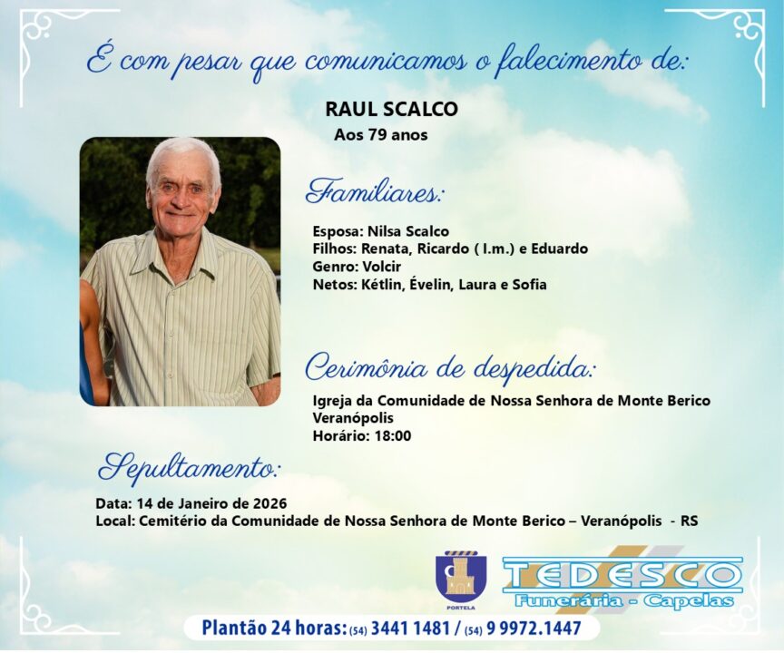 Conforme as informações de despedida, os atos fúnebres ocorrem nesta quarta-feira. A encomendação e o sepultamento serão realizados na Comunidade de Nossa Senhora de Monte Bérico, em Veranópolis. Raul deixa a esposa, Nilza Scalco, os filhos Reneta, Ricardo e Eduardo, além de genros, noras, netos e bisnetos.