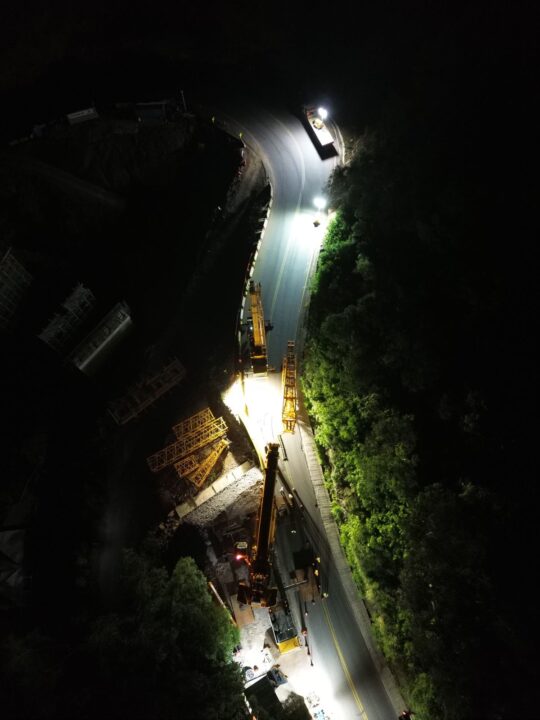 A alteração foi necessária devido às chuvas registradas na tarde de quarta-feira, 28 de janeiro, que interromperam os serviços e impactaram o cronograma das obras. Com isso, as operações de desmontagem e montagem do guindaste de grande porte, utilizadas na construção do viaduto localizado no km 193 da rodovia, foram reagendadas para as noites de sexta-feira (30) e sábado (31).
