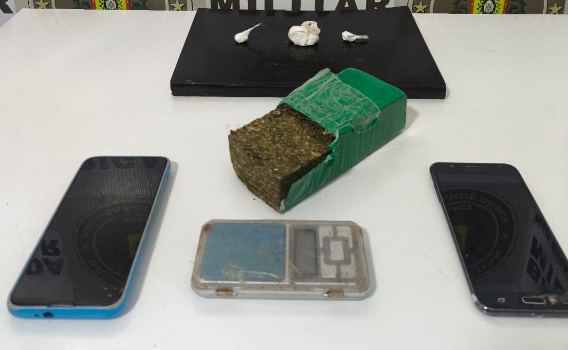 Os militares realizaram então uma busca minuciosa em um porão utilizado pelo suspeito e localizaram uma sacola escondida contendo um tijolo de maconha (423,55g), 10,3 gramas de cocaína, uma balança de precisão e aparelhos celulares.