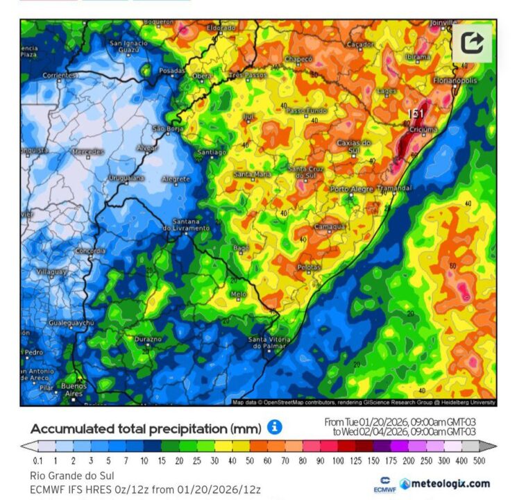 A situação mais preocupante é prevista para o sudoeste gaúcho, onde a projeção aponta praticamente ausência de precipitação nos próximos 15 dias, configurando um déficit hídrico significativo. Mapas meteorológicos reforçam a tendência de tempo seco prolongado nessa região.