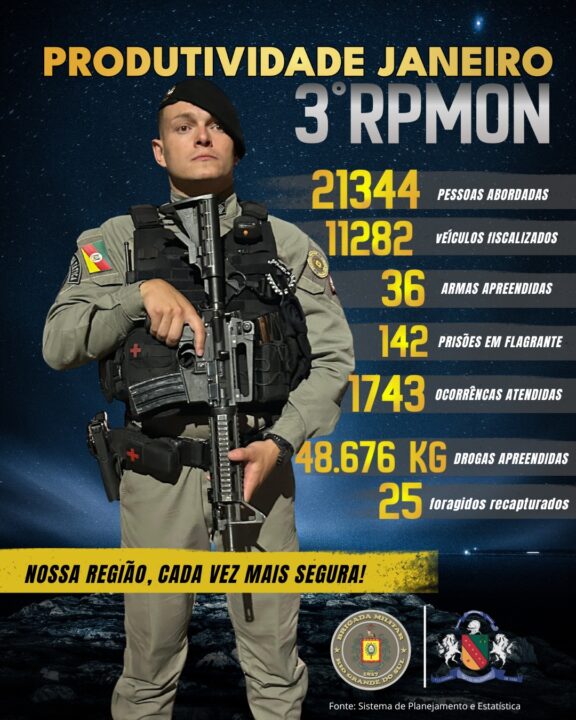 O 3º Regimento de Polícia Montada (3º RPMon) divulgou os dados de produtividade referentes ao mês de janeiro, resultado do trabalho contínuo e dedicado das guarnições que atuam diuturnamente na preservação da ordem pública e na segurança da comunidade.