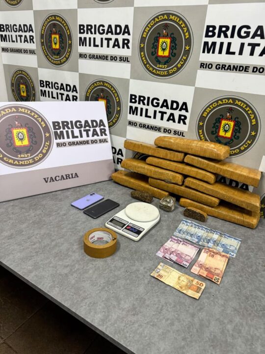 Ao todo, foram apreendidos 9 porções maiores de maconha, totalizando 8,250 quilos, além de três porções menores, somando 240 gramas. Também foram recolhidos uma balança de precisão, dois celulares, dinheiro em espécie e um rolo de fita crepe.