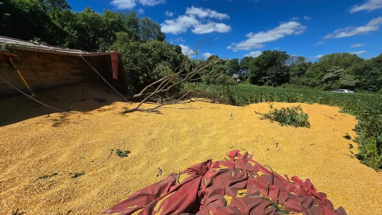 Caminhão carregado com milho tomba na BR-285 após motorista sofrer mal súbito em Passo Fundo