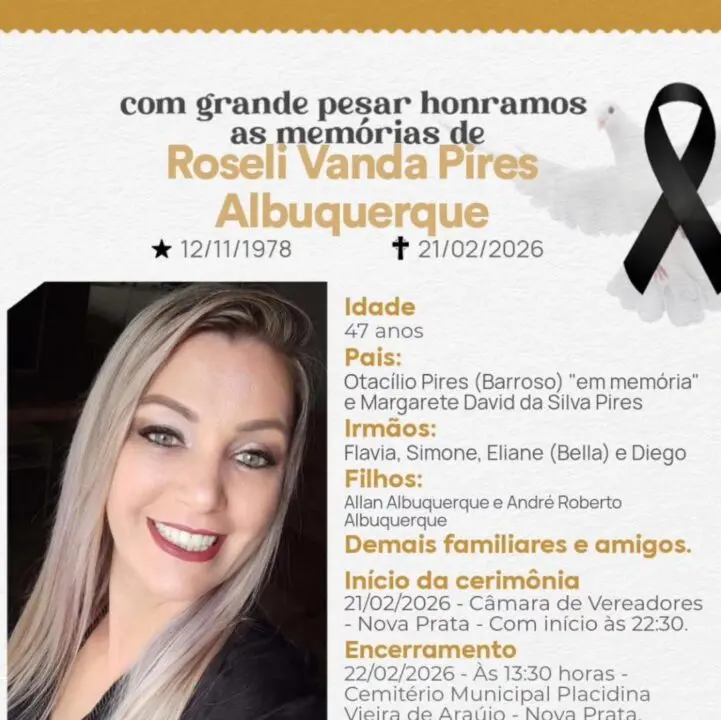 A comunidade de Nova Prata, na Serra Gaúcha, se despede com profunda tristeza da ex-vereadora Roseli Vanda Pires Albuquerque, que faleceu aos 47 anos. O velório ocorre na Câmara de Vereadores de Nova Prata, reunindo familiares, amigos e lideranças locais para as últimas homenagens.