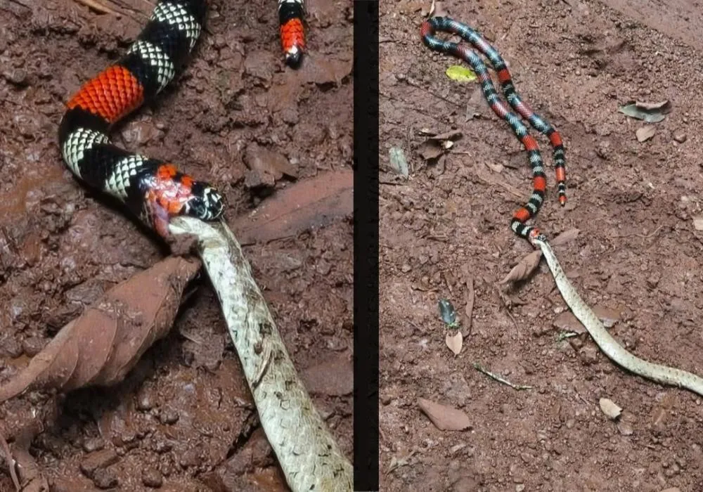 Os presentes registraram o momento em que a cobra coral matou e, em seguida, começou a devorar a jararaca, em uma cena que chamou atenção pela raridade.