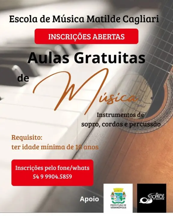A Associação Musical de Veranópolis, entidade mantenedora da Escola de Música Matilde Cagliari, está com inscrições abertas para aulas gratuitas de música destinadas a quem deseja aprender ou se especializar em um instrumento musical.