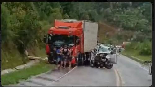As vítimas são uma mulher de 35 anos, um adolescente de 14 anos e uma criança de 8 anos, que estavam em uma caminhonete que ficou completamente destruída após colidir com um caminhão no km 65 da rodovia.