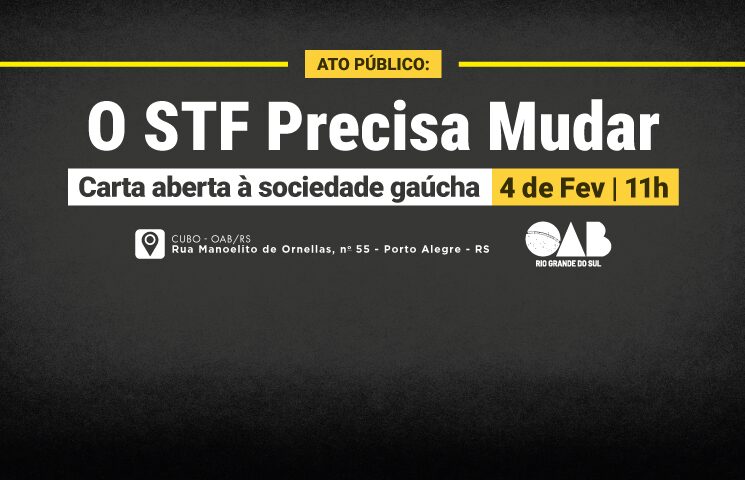 A Ordem dos Advogados do Brasil – Seccional do Rio Grande do Sul (OAB/RS) realizará, na quarta-feira, 4 de fevereiro, às 11h, o “Ato público: o STF precisa mudar – Carta aberta à sociedade gaúcha”, no auditório OAB Cubo, em Porto Alegre. A iniciativa é aberta a toda a sociedade e tem como objetivo estimular uma reflexão técnica e institucional sobre o papel do Supremo Tribunal Federal (STF) no sistema de Justiça brasileiro.