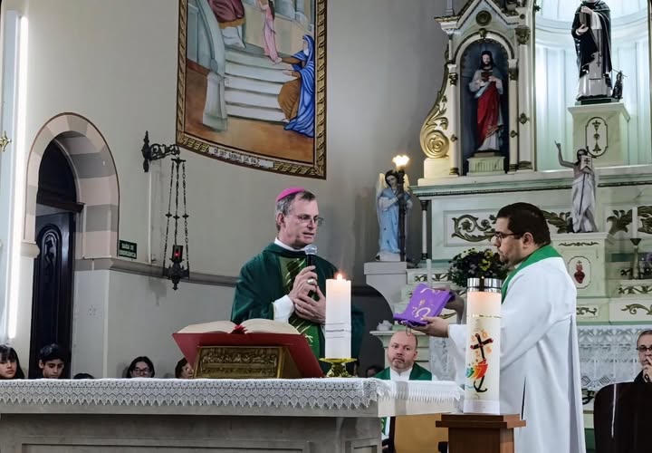 A celebração de posse foi realizada na Igreja Matriz São Domingos e presidida pelo arcebispo metropolitano, dom Rodolfo Luiz Weber, que confiou ao padre Tiago a missão de conduzir pastoralmente a comunidade.