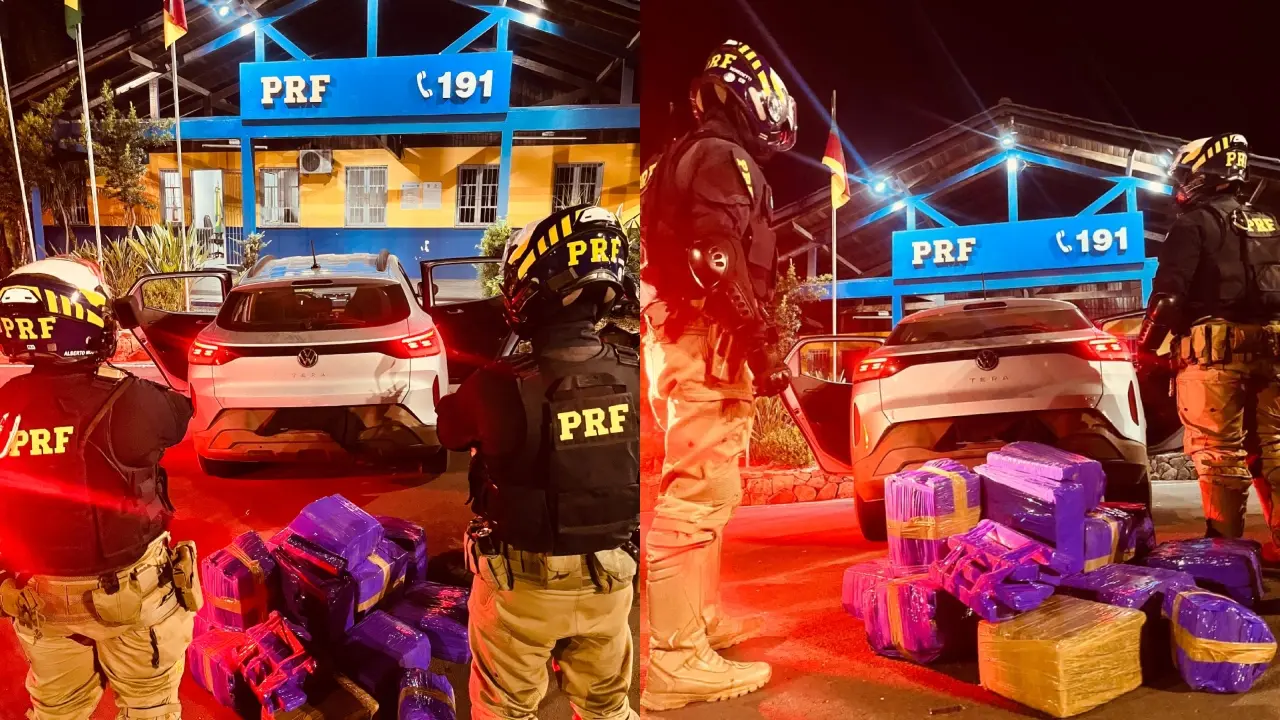 A abordagem ocorreu após os policiais interceptarem um VW/Tera com placas de Curitiba (PR). Durante a vistoria, os agentes encontraram diversos tabletes de maconha distribuídos no porta-malas e no banco traseiro do carro.