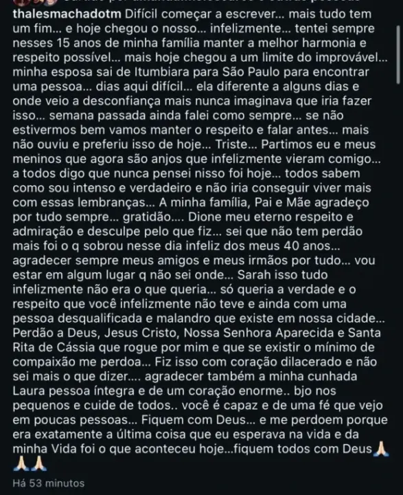 Ao final da postagem, Thales pediu perdão a familiares, amigos e a Deus: