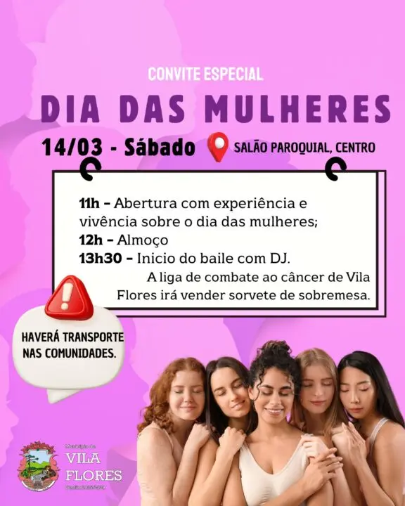 Evento acontece no sábado, 14 de março, com almoço, roda de conversa, baile e transporte gratuito para mulheres do município
