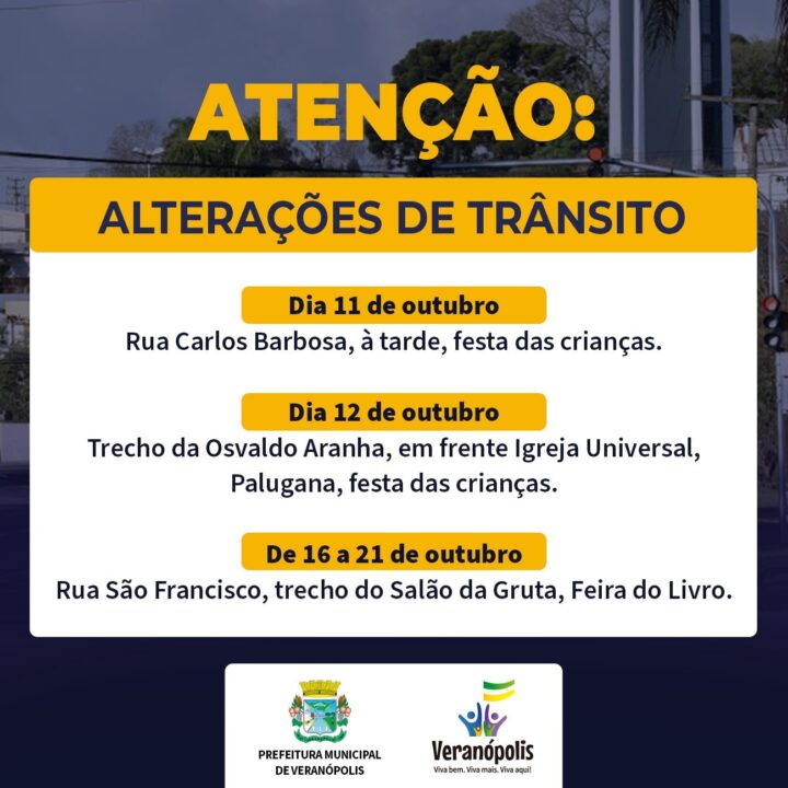 O trânsito em Veranópolis sofrerá mudanças temporárias nos próximos dias devido à realização de eventos culturais e comunitários abertos ao público. As alterações ocorrem para garantir a segurança dos participantes e facilitar a realização das atividades, que têm como objetivo promover alegria, integração e entretenimento para a comunidade.