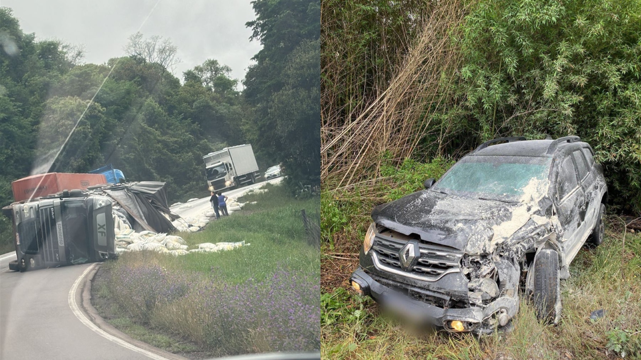 Carreta tomba e atinge automóvel na ERS-324 em Marau