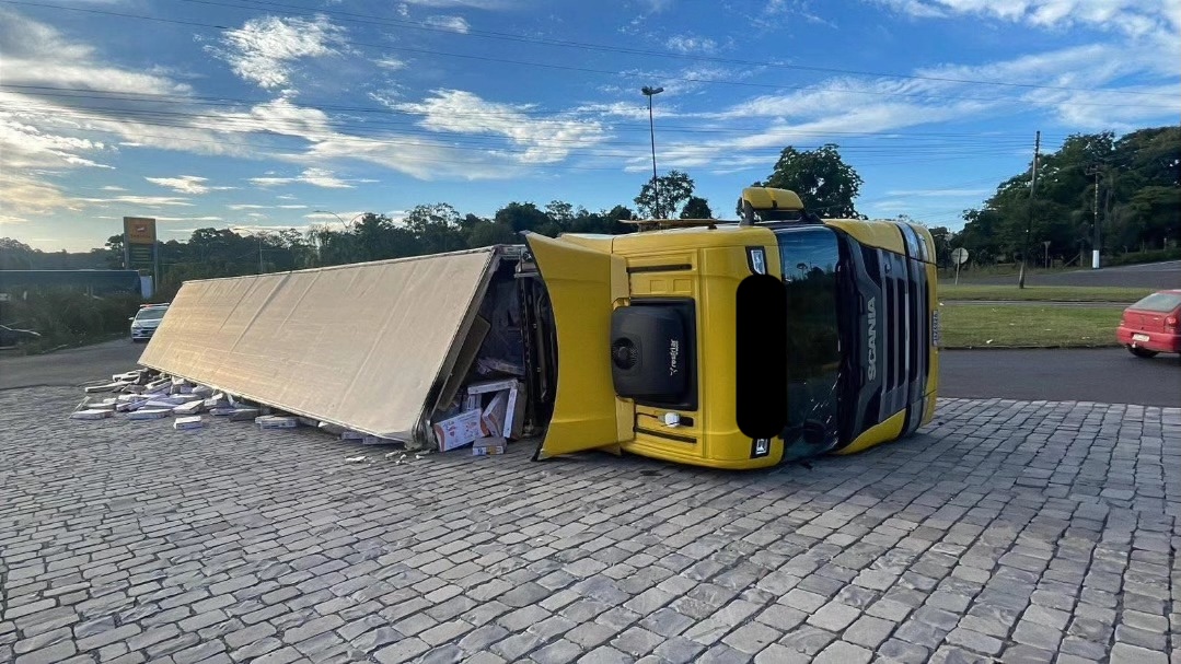 Uma carreta carregada com cortes de frango embalados tombou no trevo da Linha Vitória, na RSC-453, por volta das 18h de segunda-feira, 2 de fevereiro, em Garibaldi.
