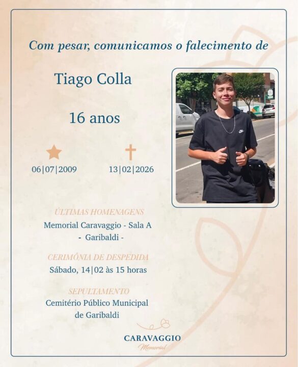 O velório do jovem Tiago Colla, de 16 anos, ocorre neste sábado no Memorial Caravaggio, sala A, em Garibaldi. O estudante, que faleceu na sexta-feira, 13 de fevereiro, lutava desde setembro de 2025 contra a Leucemia Mieloide Aguda. Descrito por amigos e familiares como um jovem alegre, ativo e apaixonado por futsal, sua trajetória mobilizou a comunidade regional em diversas correntes de solidariedade.