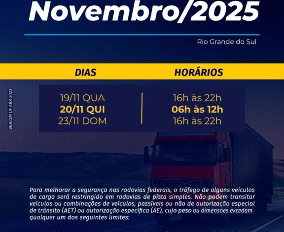 Leia mais »A Polícia Rodoviária Federal (PRF) anunciou restrição de tráfego para veículos de carga com excesso de peso ou dimensões nas…