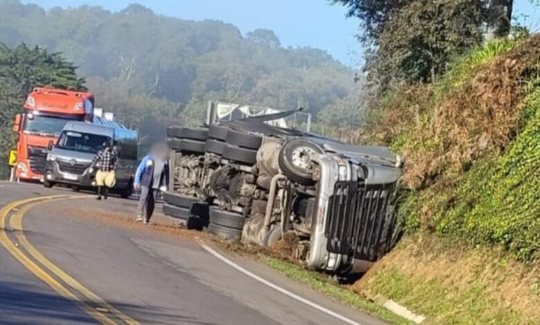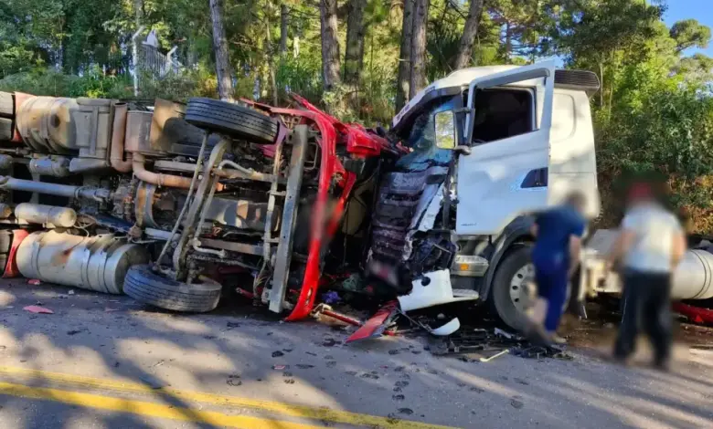 Acidente mobiliza bombeiros e deixa trânsito em pare e siga na manhã deste sábado Um caminhão Daf vermelho, com placas…