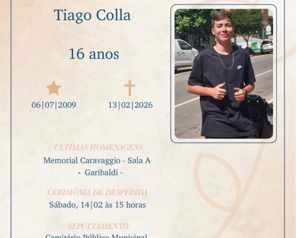 O velório do jovem Tiago Colla, de 16 anos, ocorre neste sábado no Memorial Caravaggio, sala A, em Garibaldi. O…