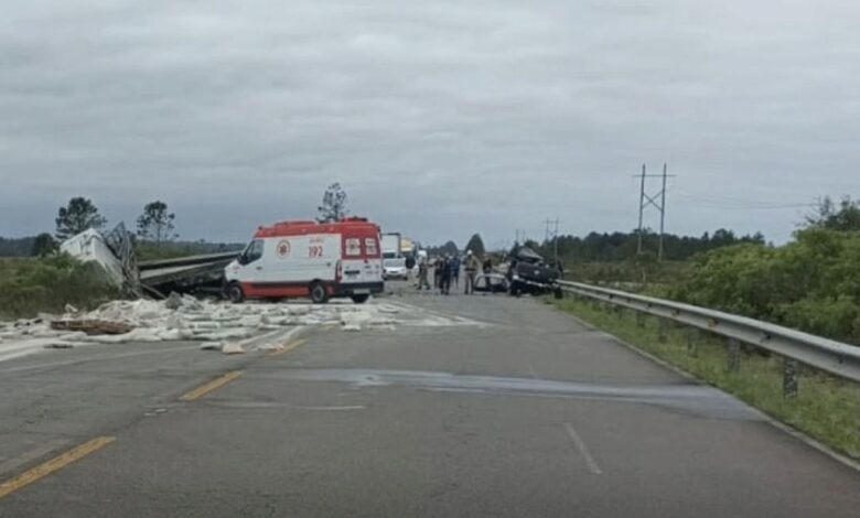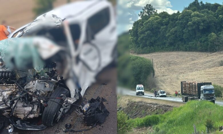 Acidente no km 256 da rodovia envolveu um Fiat Mobi, um caminhão carregado com madeira e um Ford Fusion; vítima…